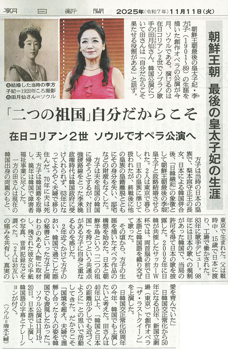 To celebrate the 50th anniversary of the normalization of diplomatic ties between Japan and South Korea, soprano Chon Wolson, a second-generation South Korean national living in Japan, will star in a new opera titled “The Last Queen.”